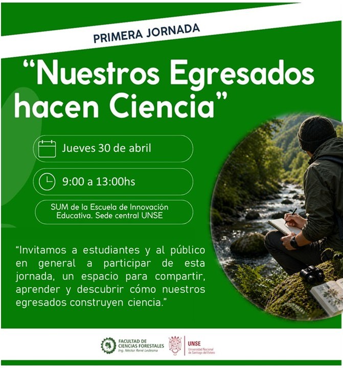 Desde la Facultad de Ciencias Forestales se invita a participar de esta Jornada que tiene como objetivo visibilizar y poner en valor el trabajo de investigación que desarrollan sus egresados/as, promoviendo el intercambio de experiencias y saberes.