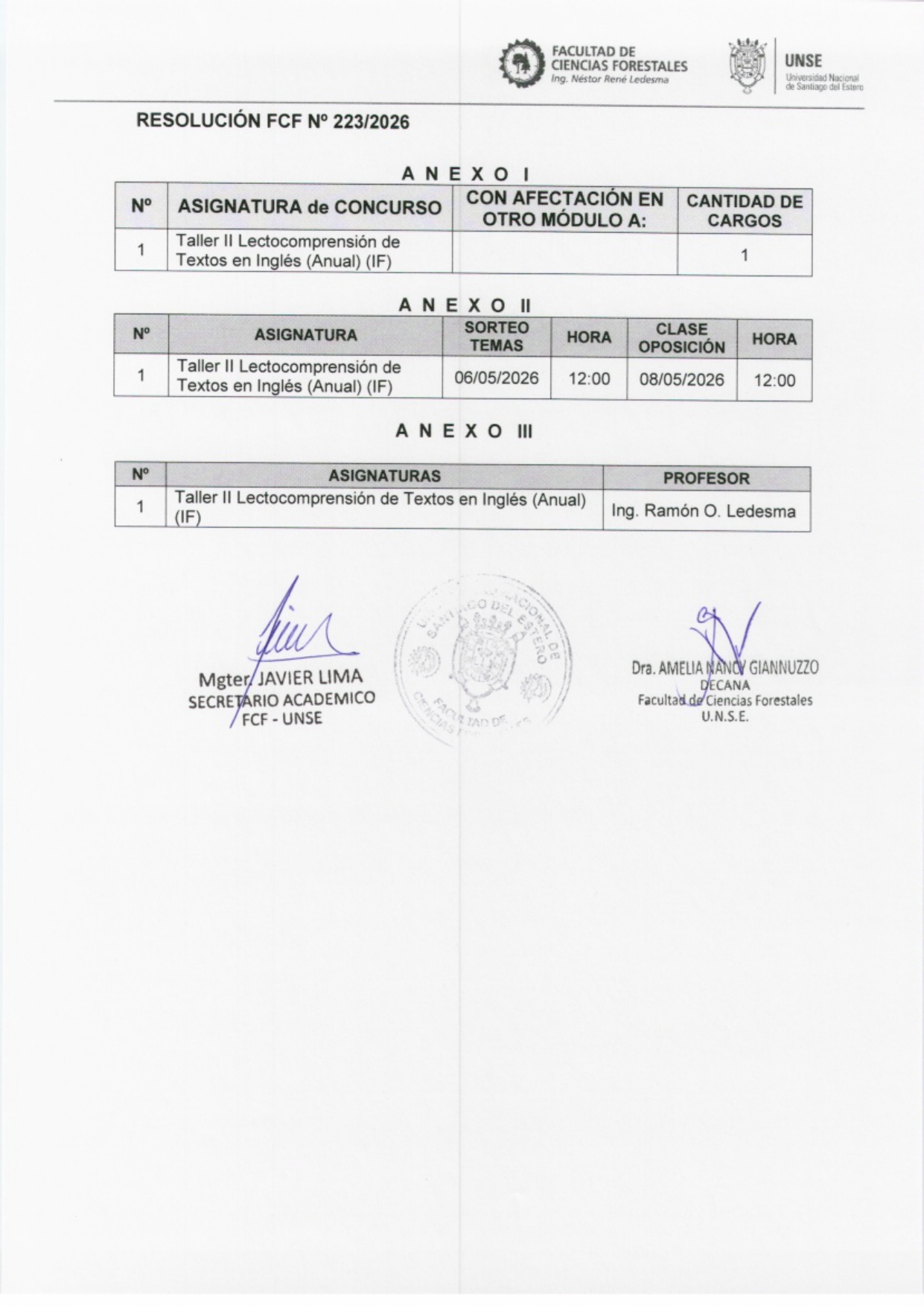 Desde la Facultad de Ciencias Forestales se informa que por Resolución FCF N°223/2026, la Decana resuelve: