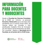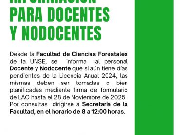 Desde la Facultad de Ciencias Forestales se  informa  al personal Docente y Nodocente, que si aún tiene días pendientes de la licencia anual 2024, las mismas deben ser tomadas o bien planificadas mediante firma de formulario de LAO hasta el 28 de noviembre del año en curso. Por consultas  dirigirse a Secretaría de la  Facultad, en el horario de 8:00 a 12:00 horas.