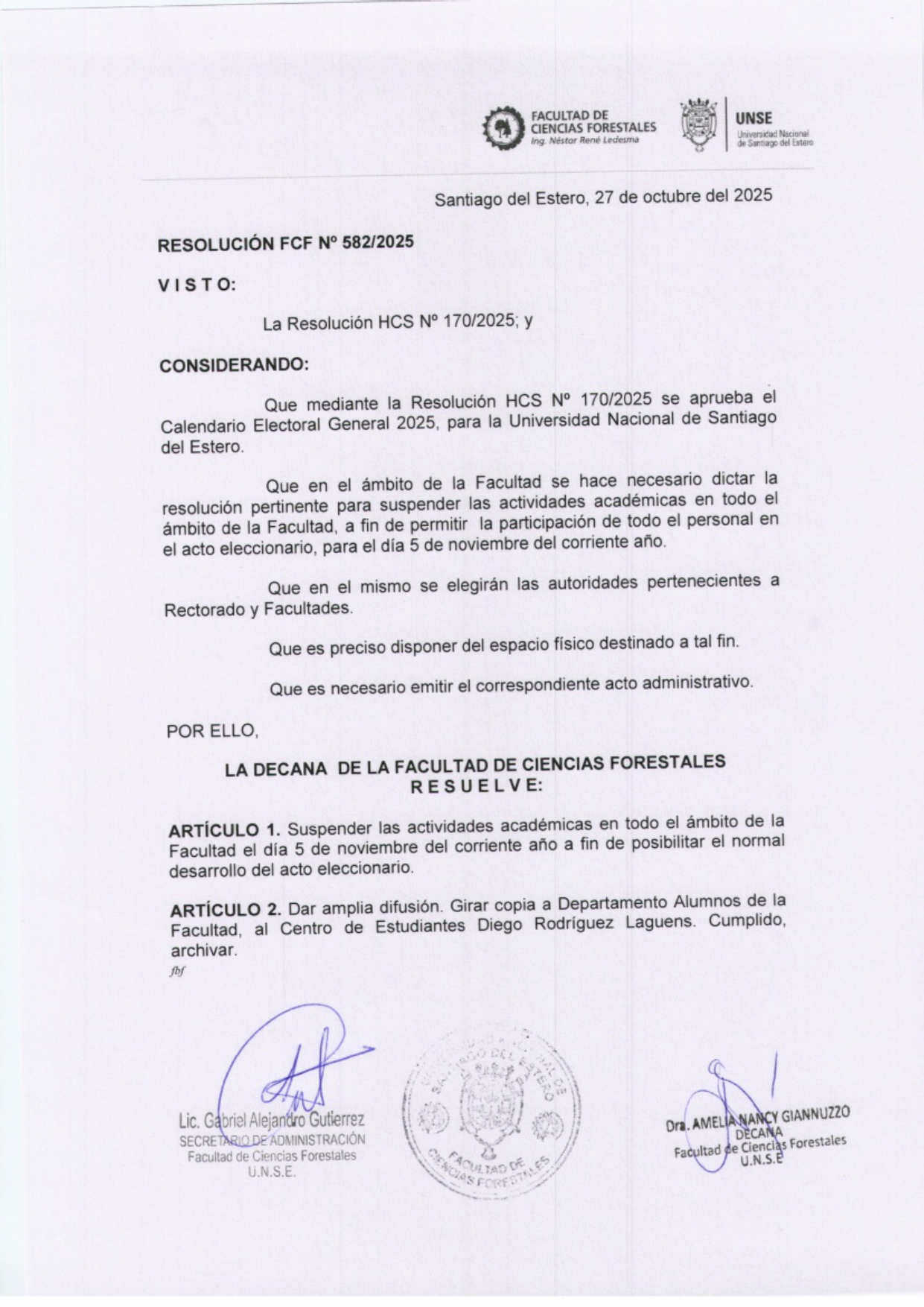 Desde la Facultad de Ciencias Forestales se informa que por Resolución FCF N°582/2025, La Decana resuelve: